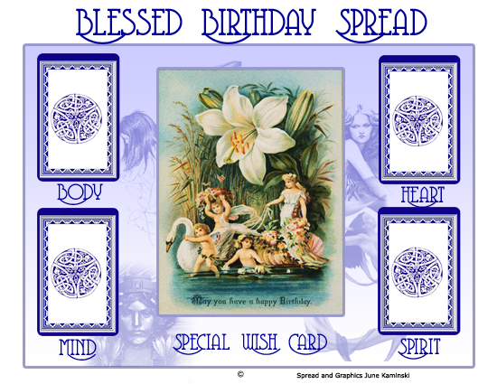 Either print out the Blessed Birthday layout page, or have it open on your computer screen with room in front of your desk or table for the five cards. As you draw the five cards, one by one, lay them on the table surface before you in the order outlined above, finishing with the fifth central card that is placed on the Victorian Birthday card image in the center. Begin with the first card in the upper left; the second card directly below it. Follow this with the third card in the upper right corner, and the fourth in the lower right side. Finish with the Special Wish card as you actually make a wish while drawing it.